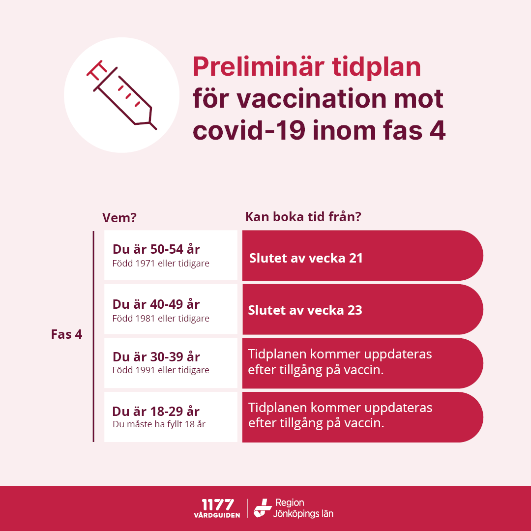 Från 1 maj till 30 juni 2021. Kan jag välja vilket vaccin jag vill ha? I dagsläget blir regionerna tilldelade vaccin som de sedan fördelar ut till upphandlade aktörer som vaccinerar. Du kommer då till ett frågeformulär. När du skickat in frågeformuläret får du en bekräftelse på att du bokat tiden.
